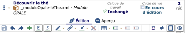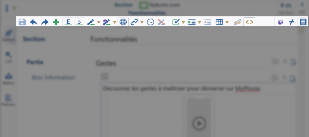 The editing bar offers several options and actions on the active item. It is contextual and adapts itself depending on the type of item, if a tag is selected, if the cursor is in the text, etc.